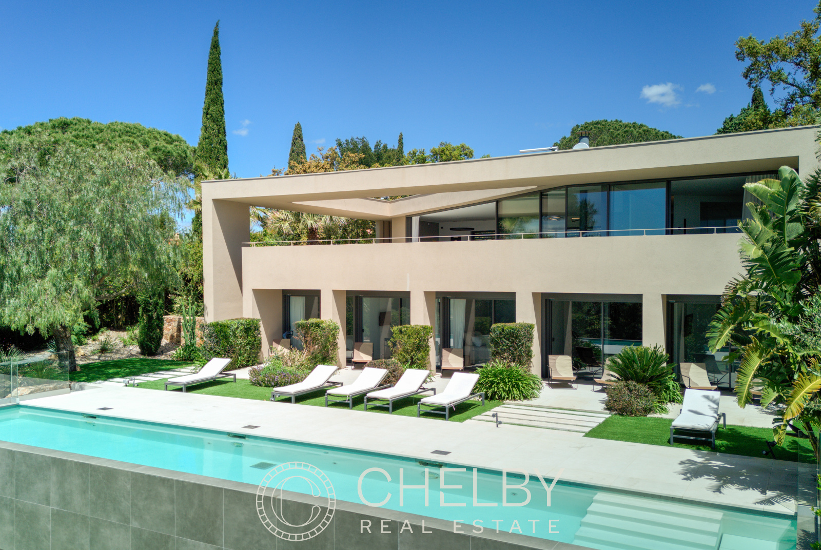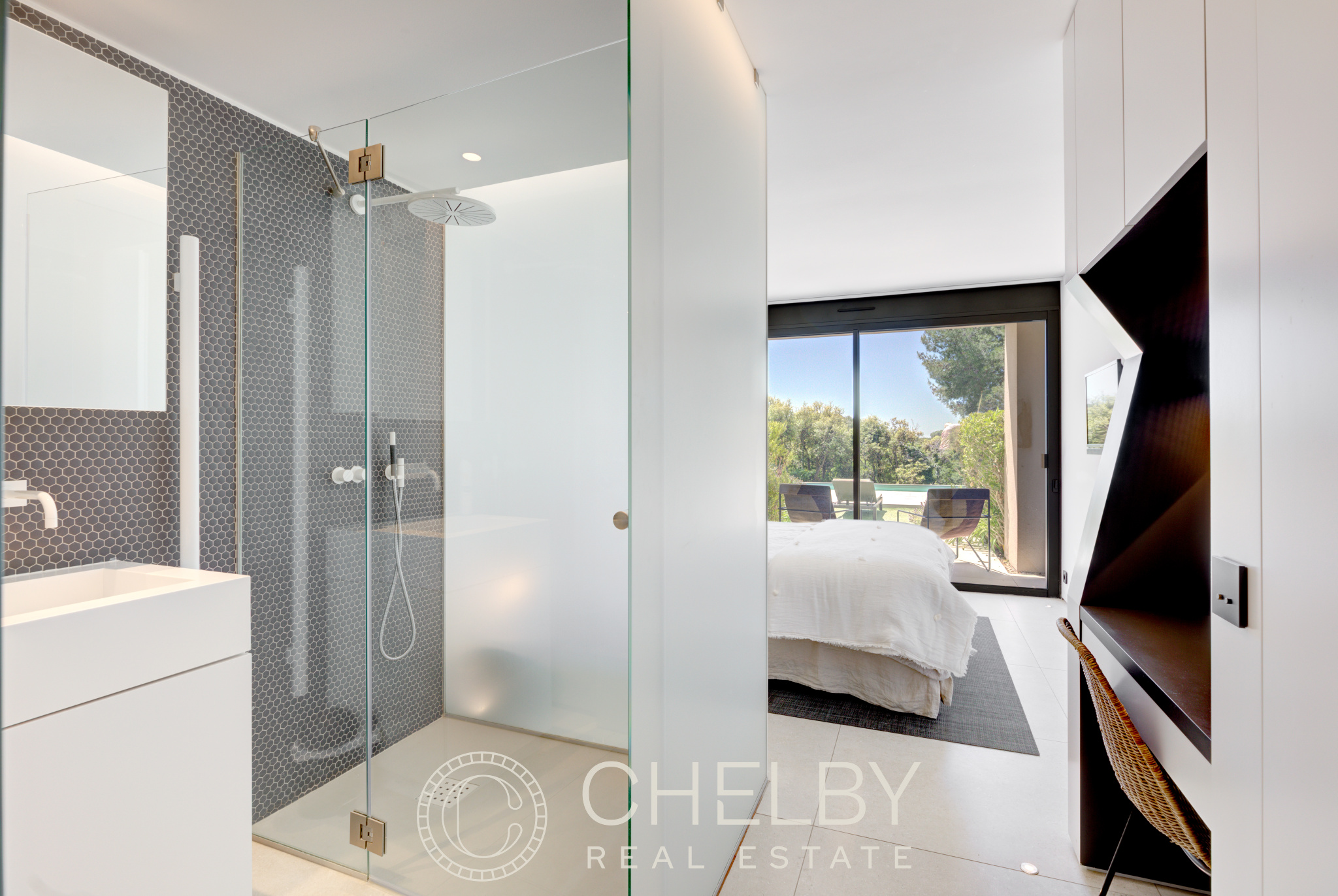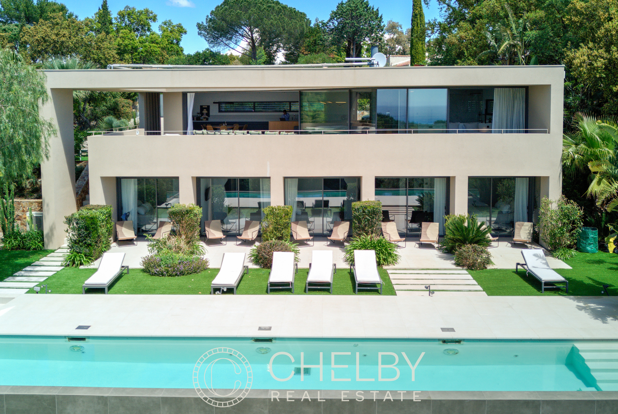 Au rez-de-jardin, vous trouverez quatre chambres en-suite, chacune avec sa propre salle de bain, terrasses privées donnant directement sur la piscine. Un coin TV et une buanderie complètent l’ensemble, offrant un confort supplémentaire.