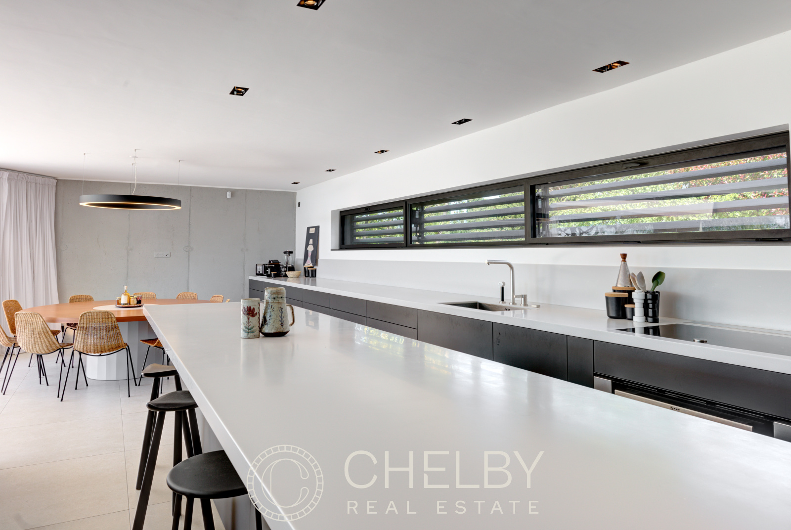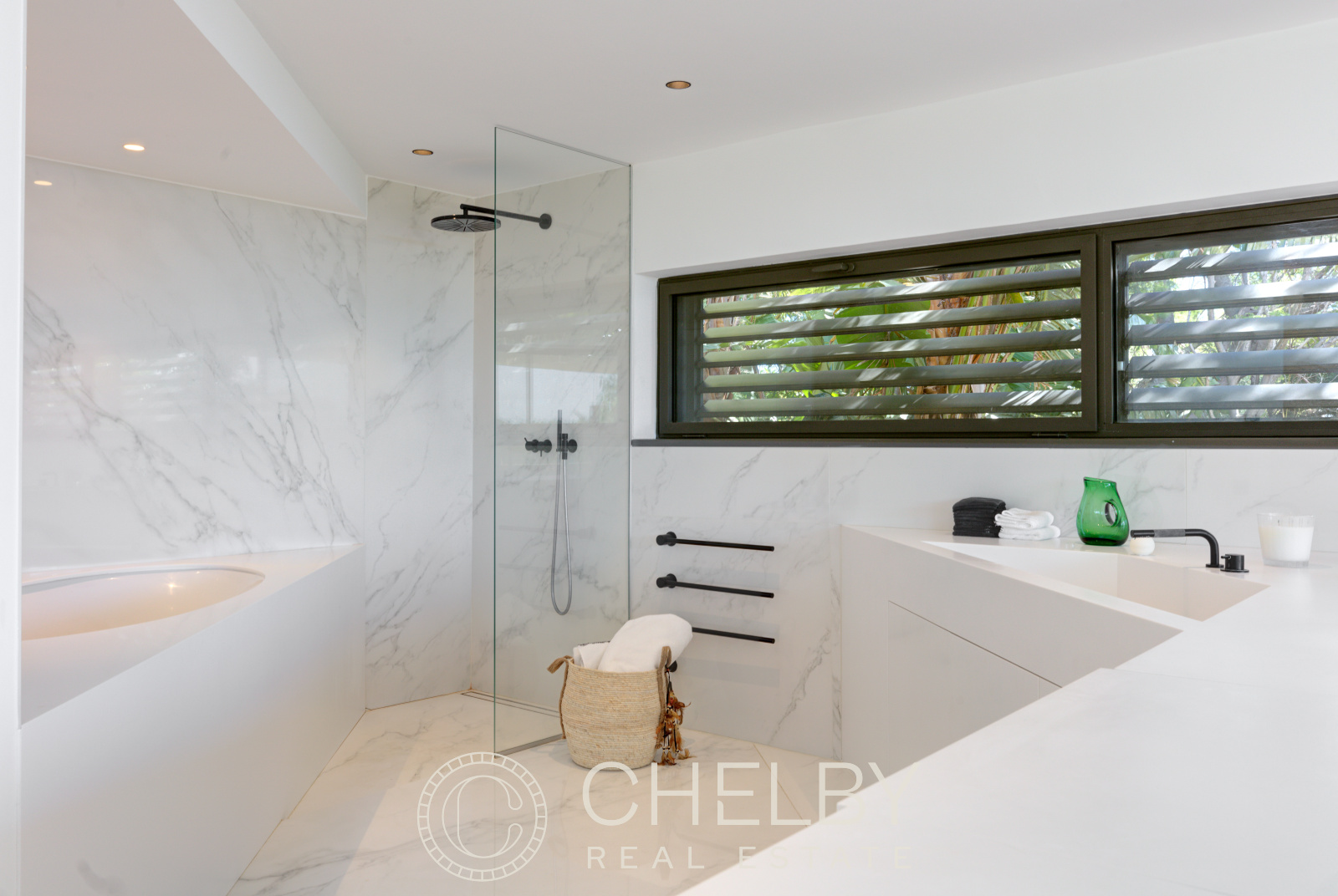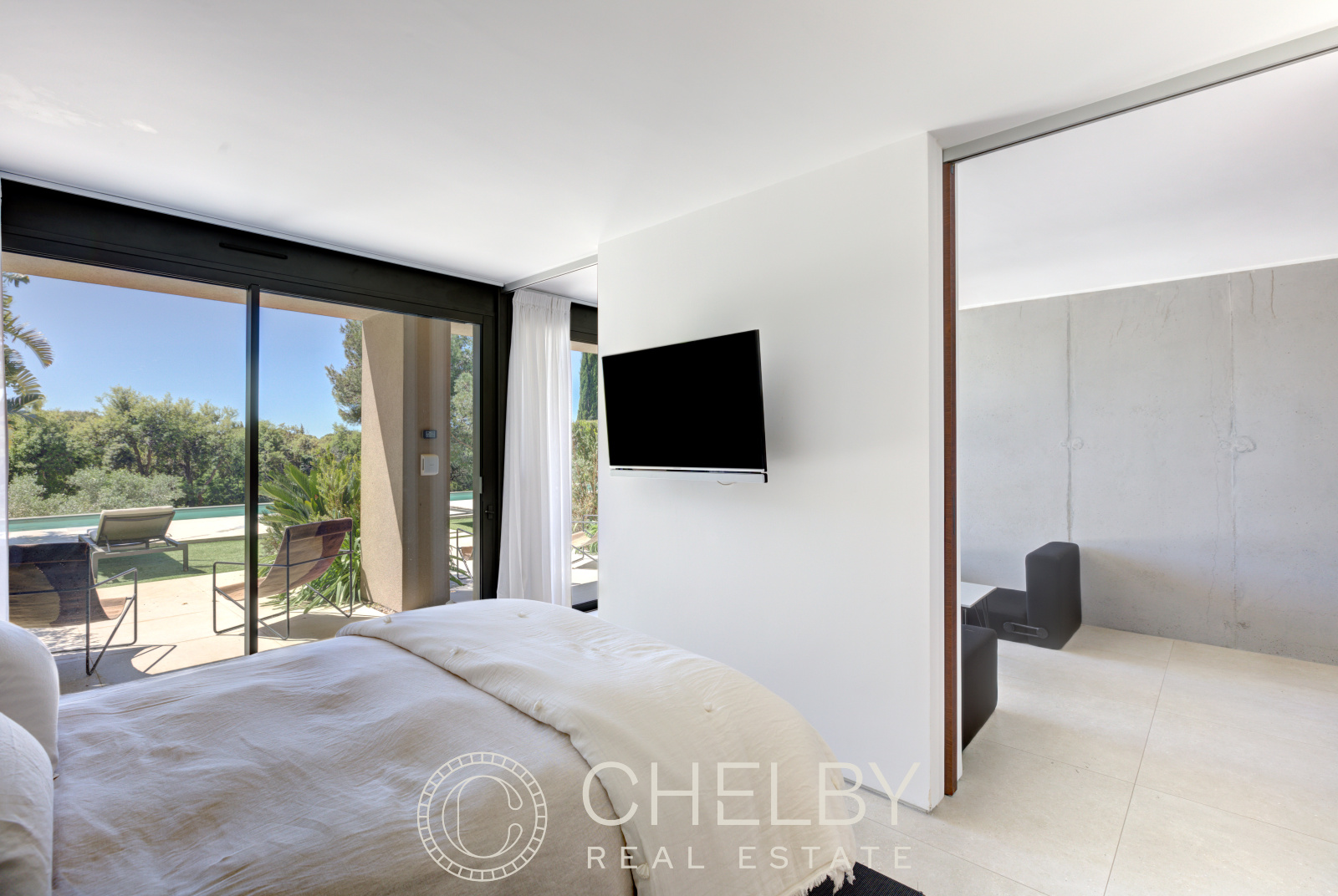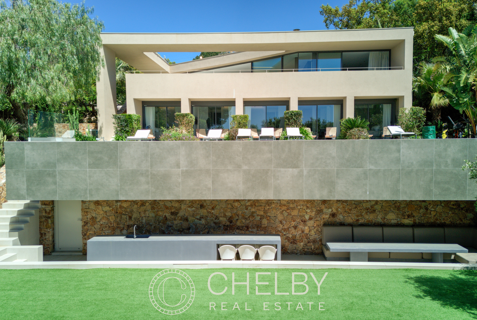 Au rez-de-jardin, vous trouverez quatre chambres en-suite, chacune avec sa propre salle de bain, terrasses privées donnant directement sur la piscine. Un coin TV et une buanderie complètent l’ensemble, offrant un confort supplémentaire.