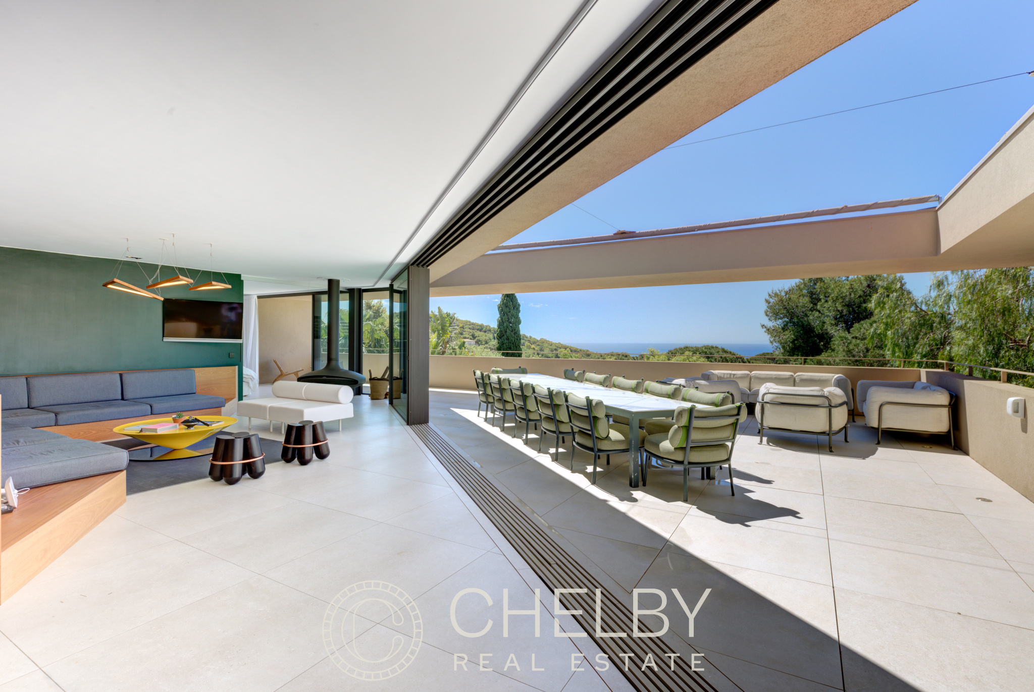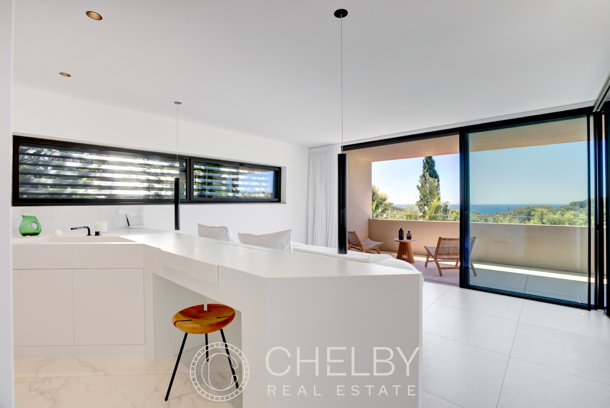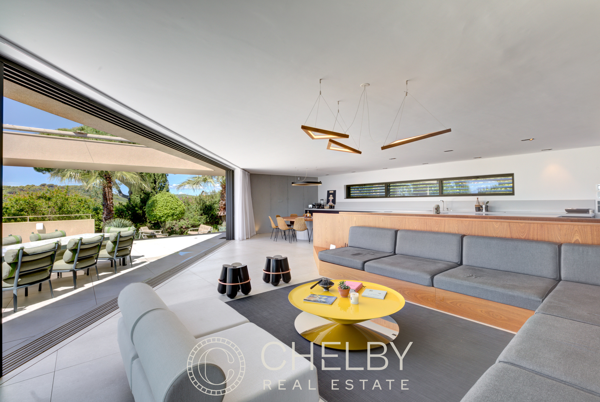 Cette villa contemporaine vous offre un séjour lumineux avec salon et salle à manger ouverts, ainsi qu'une cuisine américaine entièrement équipée. L'espace de vie s'ouvre sur une terrasse avec vue mer, idéale pour profiter de la vue panoramique sur la baie de Ramatuelle.