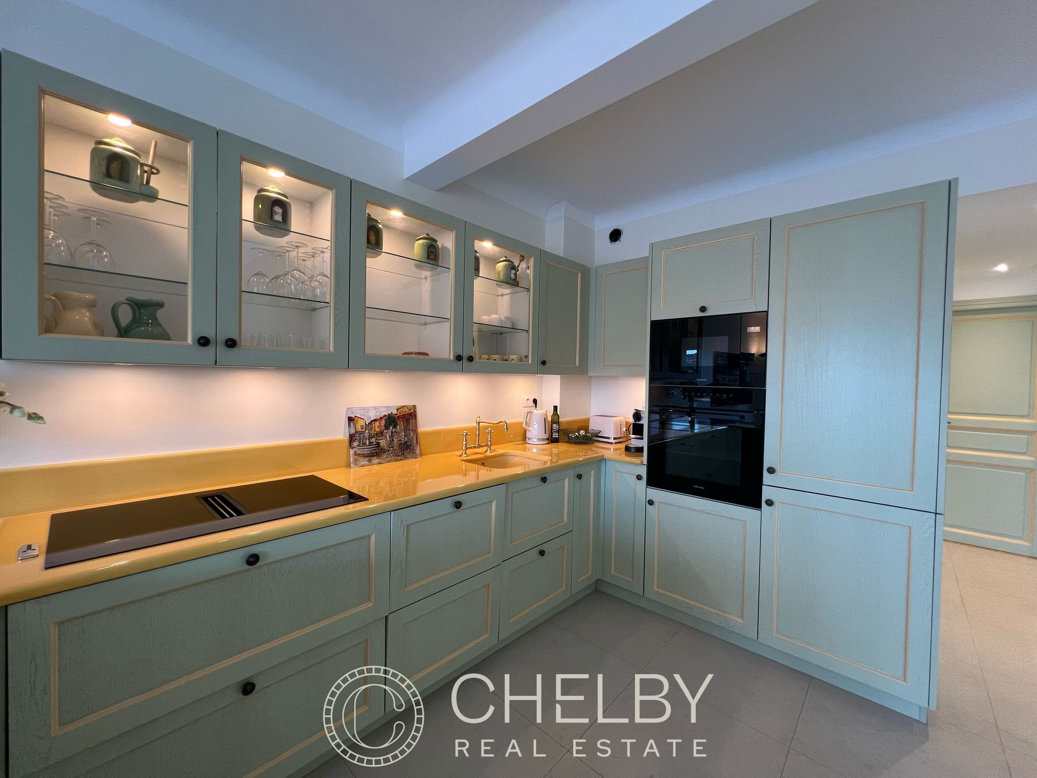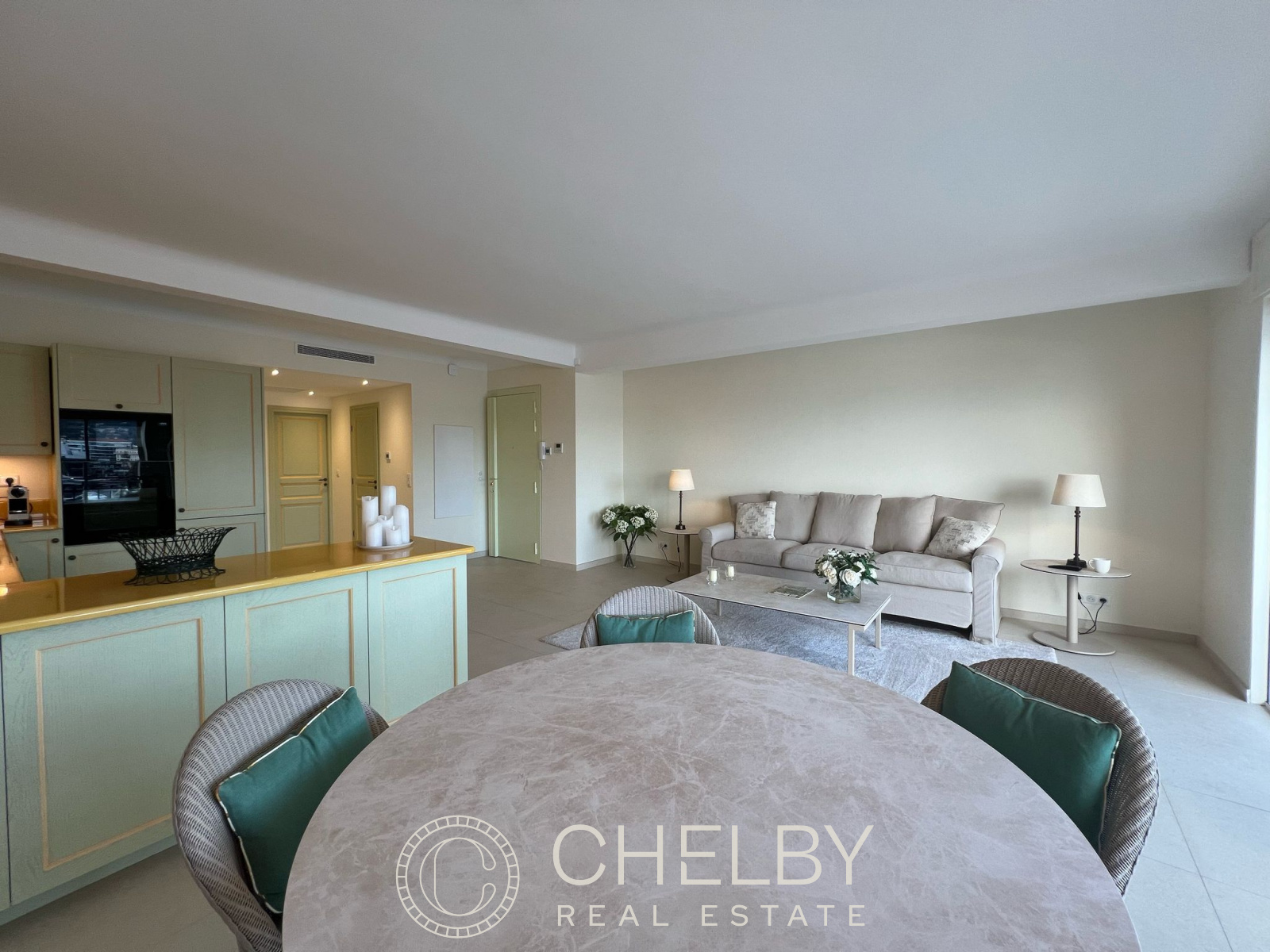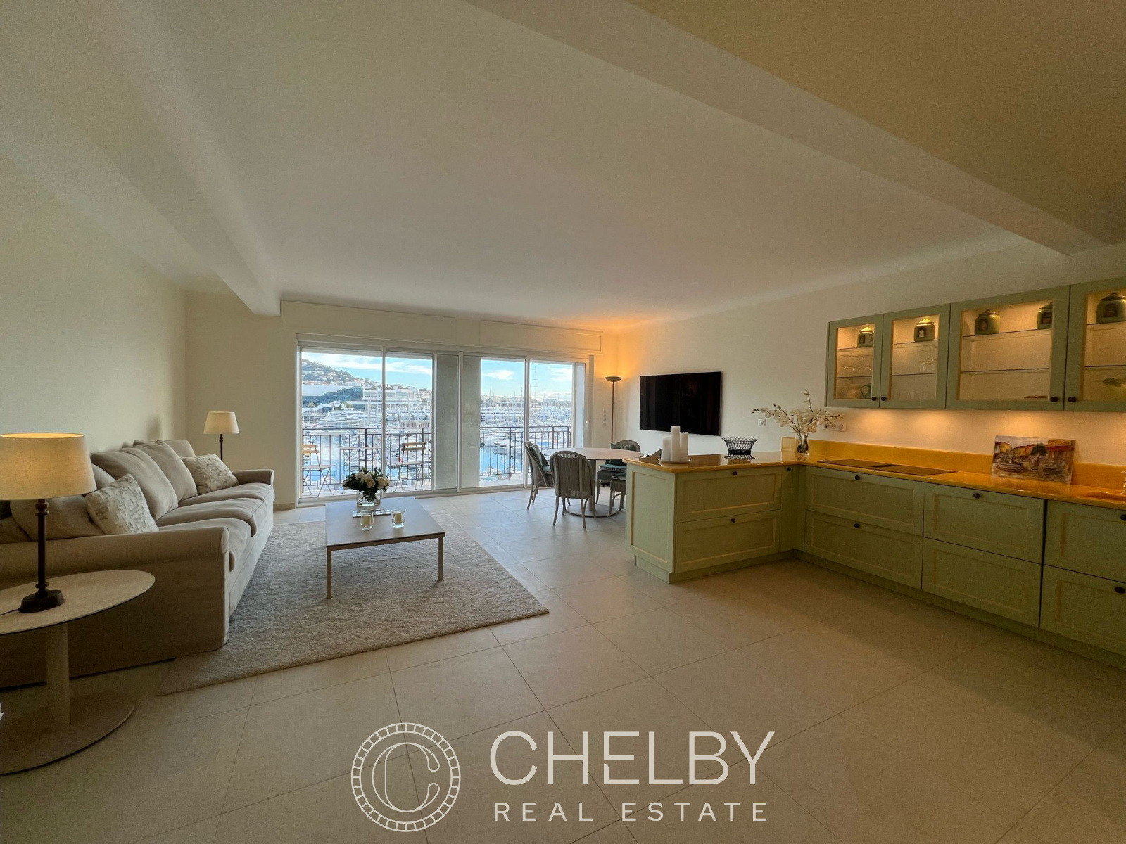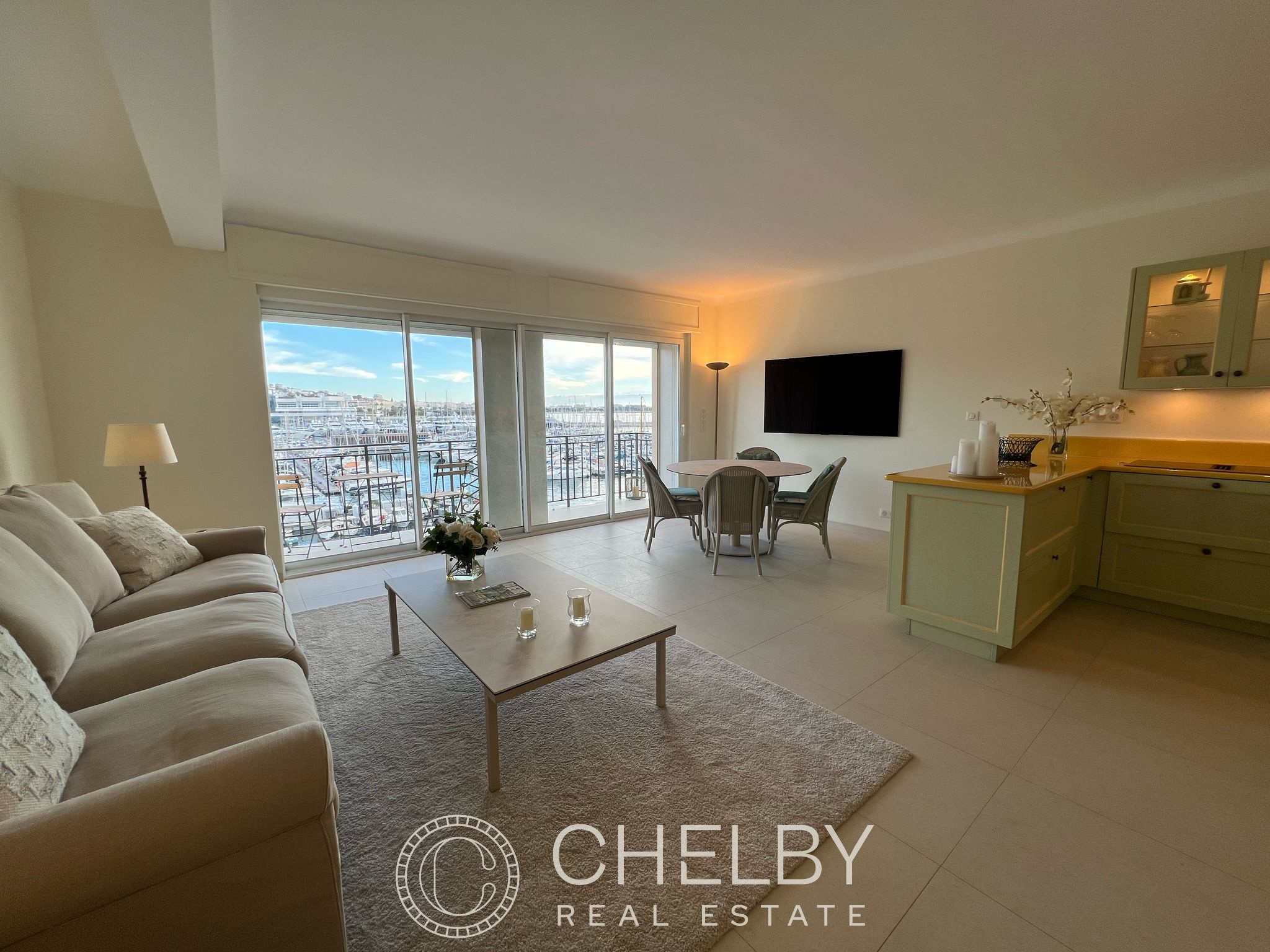 Espace de vie : Un séjour lumineux et ouvert sur une cuisine entièrement équipée, offrant une vue spectaculaire sur la mer et le port.