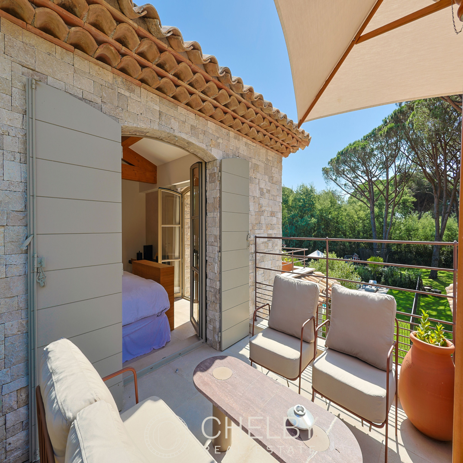 - La chambre principale est située à l'étage supérieur avec terrasse privée, offrant une vue panoramique sur le jardin et la piscine.