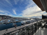 Espace de vie : Un séjour lumineux et ouvert sur une cuisine entièrement équipée, offrant une vue spectaculaire sur la mer et le port.